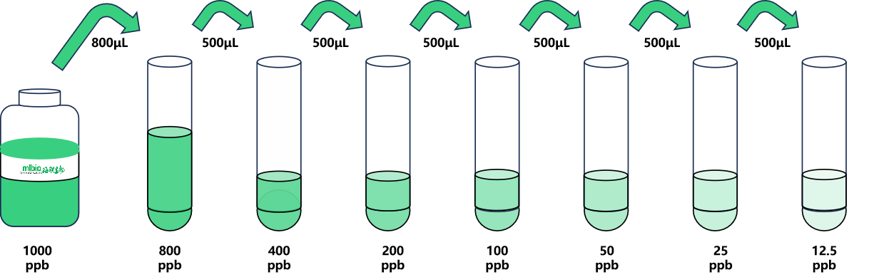 試劑盒中取出標準品,準備7個試管,先將1000ppb標準品(1mL)按需吸取一定量用1×稀釋液稀釋至800ppb(例:800µL的標準品母液+200µL的1×稀釋液,制備得到1000μL的800ppb濃度標準品),隨后在6個試管中分別加入500μL的1×稀釋液,在這6個單獨的試管中將800ppb標準品依次2倍倍比稀釋至7個梯度,共配制7個濃度的標準品,依次為:800ppb、400ppb、200ppb、100ppb、50ppb、25ppb、12.5ppb,從最高濃度標準品溶液中吸取500μL標準品到下一個試管中,輕輕吹打混勻,以此類推進行標準品的倍比稀釋(如圖所示),1×稀釋液用作零濃度標準品(0ppb)。