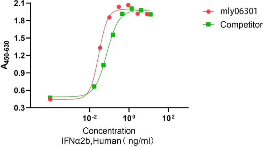 Measured in a VSV inhibition assay with Wish cells. The ED50  this effect is ≤100 pg/mL, corresponding to a specific activity is ≥2 × 108  units/mg. The activity of   mly06301 was higher than the other competing product.